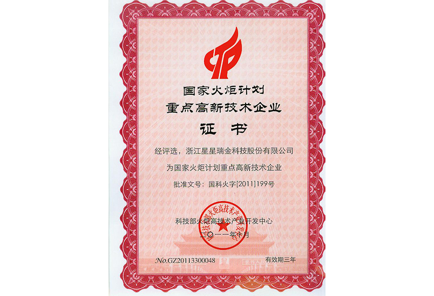 11.2.1-20国家火炬计划重点高新技术企业证书201110